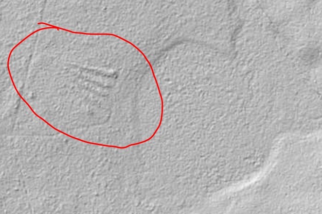 Pomiędzy dawnym rozlewiskiem a leśną drogą znajduje się pięć wachlarzowato ułożonych nasypów ziemnych. Formy są ledwo widoczne w terenie – odkryto je na mapach systemu LIDAR, obrazujących powierzchnię terenu metodą skaningu laserowego.