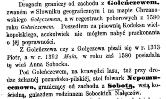 Miejscowości i ich nazwy pojawiają się i znikają bez żadnego śladu. Jedną z takich wsi, czy raczej zamieszkanych folwarków, jest Nepomucenowo. Ta nazwa pierwszy raz pojawia się na mapie powiatu poznańskiego z 1836 roku. 10 to liczba mieszkańców – czyli w ówczesnej praktyce jedna, maksymalnie dwie chałupy. Skrót „Vw” oznacza folwark (niem. Vorwerk), co oznacza, że nie była to samodzielna miejscowość, a raczej część majątku w Golęczewie.