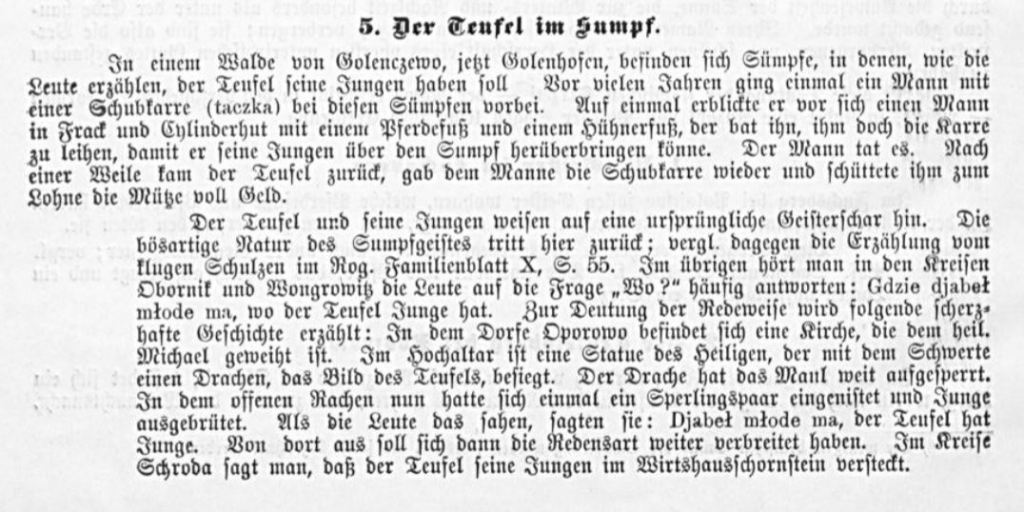 Tłumaczenie własne; fragment pochodzi z broszury Otto Knoopa „Posener Dämonensagen. Ein Beitrag zur Sagenkunde der Provinz Posen, in: Königl. Gymnasium in Rogasen. Wissenschaftliche Beilage zum Osterprogramm 1912, Rogasen 1912” –