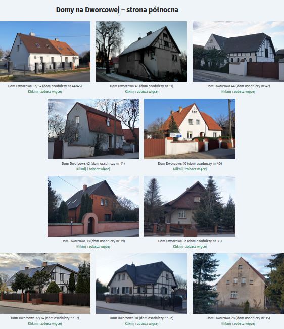Pierwsze strony poświęcone poszczególnym obiektom powstały jeszcze w maju br. Stopniowo dodawałem kolejne domy, na każdej stronie zamieszczając obecne i (jeśli mam) stare zdjęcia, a także znane mi fakty o danym miejscu. Listopad był uwieńczeniem tej pracy. Dzięki przygotowaniu spisu osadników Golenhofen, na wielu stronach dodałem informacje o pierwszych mieszkańcach zabytkowych domów. Wreszcie, uzupełniłem zestaw stron o te skromniejsze budynki, w tym – domy z ul. Tysiąclecia i niektóre z ul. Dworcowej.