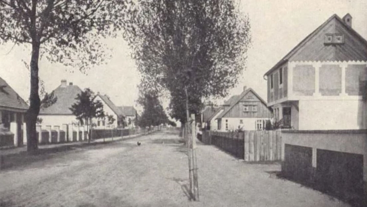 Rysunek przedstawia ul. Dworcową (widok w stronę stacji kolejowej) i skrzyżowanie z ul. Polną. Z prawej strony widzimy charakterystyczny wysoki dom pod adresem Dworcowa 45.