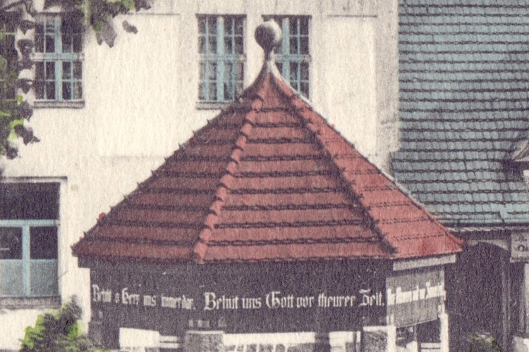 Jak wyglądał dach studni i gąsiory na nim – możemy zobaczyć na fragmencie pocztówki z ok. 1910 roku. Przy okazji, można się przekonać, że „artysta”, który kolorował pocztówkę do druku, nie był nigdy w Golęczewie, bo pomalował dach na czerwono, a dachówki w rzeczywistości były ciemnografitowe.