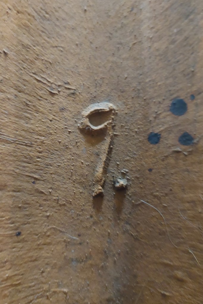 Od spodniej strony posiadają wypukłą cyfrę 9 – na tę chwilę nie wiem, co ona oznaczała. W jednym z nich zachował się oryginalny gwóźdź, mocujący element do konstrukcji dachu.