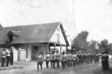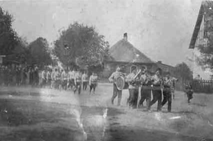 Tutaj narodowcy maszerują pod golęczewską starą remizą. Zwraca uwagę orkiestra.