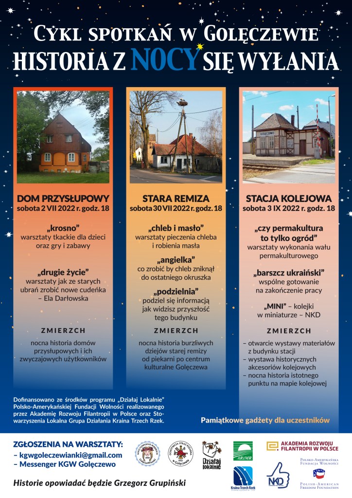 Na zaproszenie Koła Gospodyń Wiejskich w Golęczewie będę miał przyjemność uczestniczyć w trzech warsztatach z cyklu „Historia z nocy się wyłania”. Moją rolą będzie zaprezentowanie historii miejsc, w których odbędą się warsztaty.