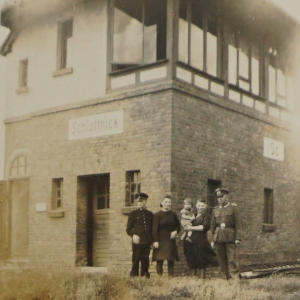Kolejne zdjęcia, niewątpliwie z czasów II wojny światowej, przedstawiają grupę ludzi pod budynkiem kolejowym w Złotnikach (przemianowanych wówczas na Schlottnick), a także – dwie córki Friedricha i Margarethe Rosinger na golęczewskich polach.