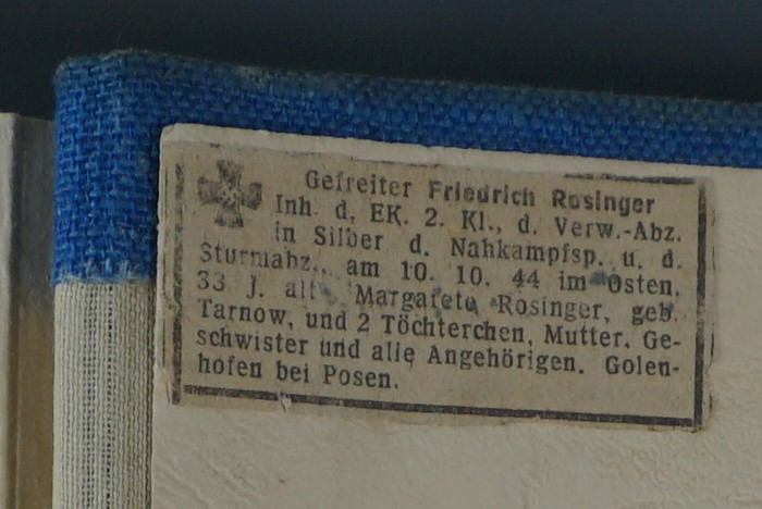 10 października 1944 roku szeregowy Fryderyk ginie na wschodnim froncie (o czym mówi zamieszczony w albumie nekrolog z gazety). Rok później niemal cała rodzina Rosingerów ucieka przed Rosjanami do Niemiec.