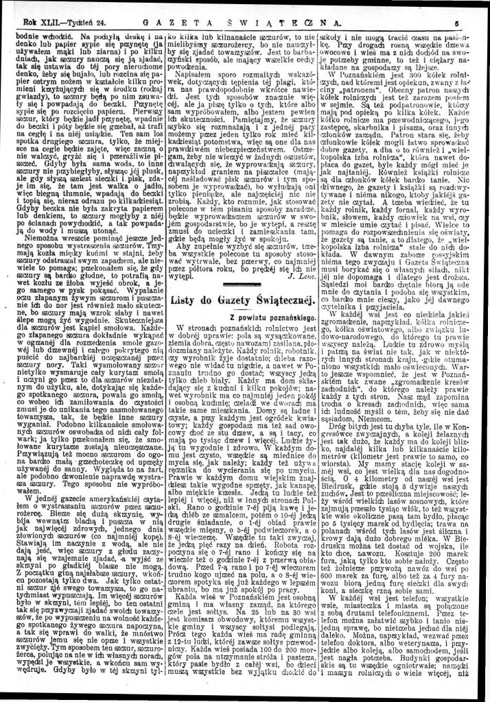 W Poznańskiem jest 300 kółek rolniczych, nad któremi jest opiekun, zwany z łaciny „patronem”. Obecny patron naszych kółek rolniczych jest też zarazem posłem w sejmie. Są też podpatronowie, którzy mają pod opieką po kilka kółek. Każde kółko rolnicze ma przewodniczącego, jego zastępcę, skarbnika i pisarza, oraz innych członków zarządu. Patron stara się, żeby członkowie kółek mogli łatwo sprowadzać dobre gazety, a dba o to również i „wielkopolska izba rolnicza”, która nawet dopłaca do gazet, byle każdy mógł mieć je jak najtaniej. Również książki rolnicze są dla członków kółek bardzo tanie. Nic dziwnego, że gazety i książki są rozchwytywane i niema nikogo, ktoby jakiejś gazety nie czytał. A trzeba wiedzieć, że tu każdy rolnik, każdy fornal, każdy wyrobnik, słowem, każdy człowiek na wsi, czy w mieście umie czytać i pisać. Wielce to pomaga do rozpowszechnienia się oświaty, że gazety są tanie, a to dlatego, że „wielkopolska izba rolnicza” stale do nich dokłada. W dawnym zaborze rosyjskim niema tego zwyczaju i Gazeta Świąteczna musi borykać się o własnych siłach, nikt jej nie dopomaga i dlatego jest droższa. Sąsiedzi moi bardzo chętnie biorą ją ode mnie do czytania i podoba się wszystkim, co bardzo mnie cieszy, jako jej dawnego czytelnika i przyjaciela. W każdej wsi jest co niedziela jakieś zgromadzenie, naprzykład, kółka rolniczego, kółka oświatowego albo związku ludowo – narodowego, do którego tu prawie wszyscy należą. Ludzie tu zdrowo myślą i patrzą na świat nie tak, jak w niektórych innych stronach kraju, – gdzie otumaniono wszystkich i mało oświeconych. Warto jeszcze wspomnieć, że jest w Poznańskiem tak zwane „zgromadzenie kresów zachodnich”, do którego należy prawie każdy z tych stron. Nasz rząd zapomina trocha o kresach zachodnich, więc sama ich ludność myśli o tem, żeby się nie dać sąsiadom, Niemcom.