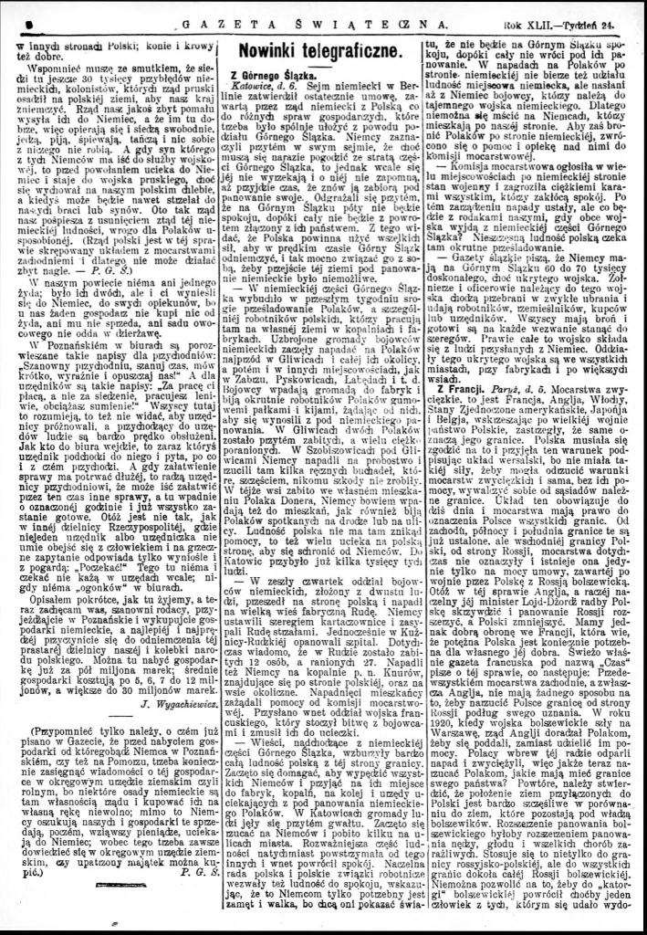Wspomnieć muszę ze smutkiem, że siedzi tu jeszcze 30 tysięcy przybłędów niemieckich, kolonistów, których rząd pruski osadził na polskiej ziemi, aby nasz kraj zniemczyć. Rząd nasz jakoś zbyt pomału wysyła ich do Niemiec, a że im tu dobrze, więc opierają się i siedzą swobodnie, jedzą, piją, śpiewają, tańczą i nic sobie z niczego nie robią. A gdy syn, którego z tych Niemców ma iść do służby wojskowej, to przed powołaniem ucieka do Niemiec i staje do wojska pruskiego, choć się wychował na naszym polskim chlebie, a kiedyś może będzie nawet strzelał do naszych i braci lub synów. Oto tak rząd nasz pośpiesza z usunięciem ztąd tej niemieckiej ludności, wrogo dla Polaków usposobionej. (Rząd polski jest w tej sprawie skrępowany układem z mocarstwami zachodniemi i dlatego, nie może działać zbyt nagle. — P.G.Ś.)