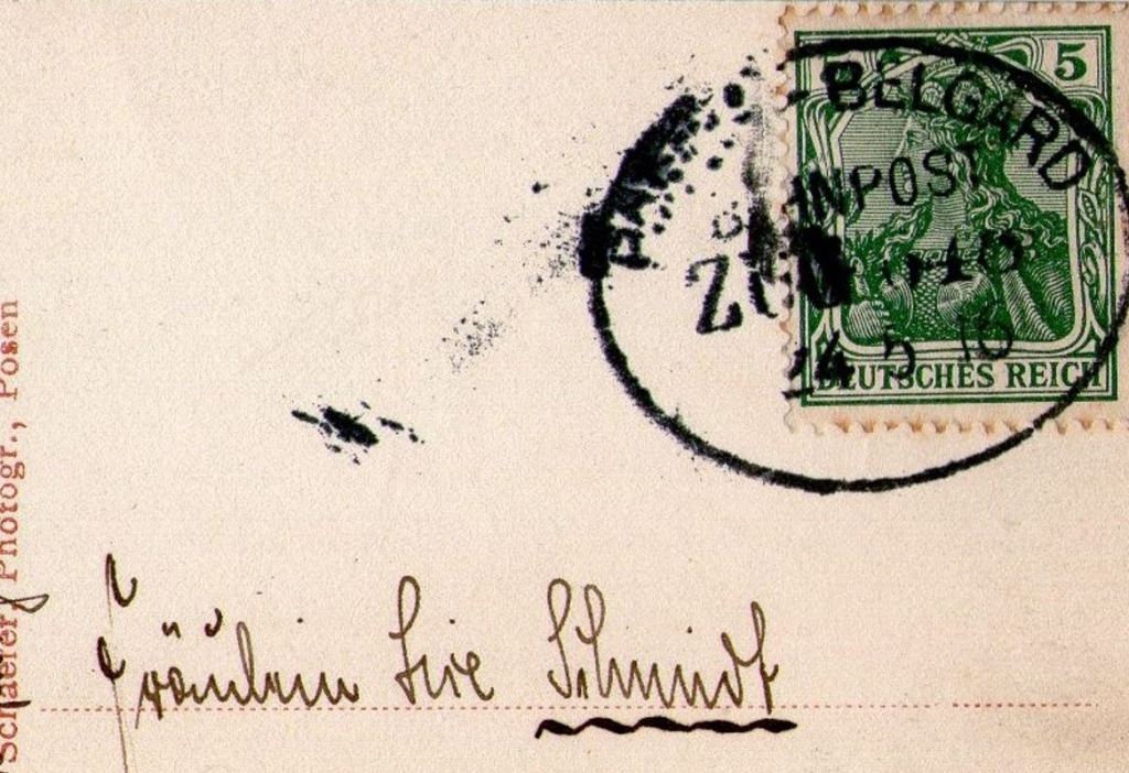 Swoją drogą, warto zwrócić uwagę na stempel z tekstem „Bahnpost Posen – Belgard”. Przesyłki pocztowe nadawało się bezpośrednio w wagonie pocztowym linii Poznań – Białogard.