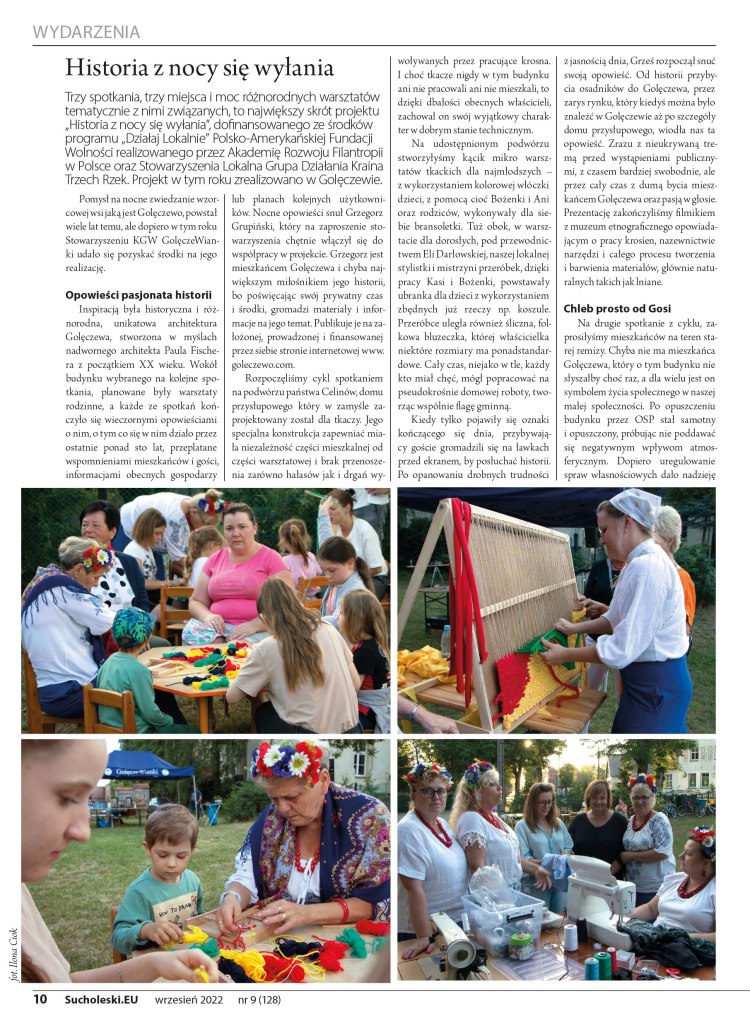 Projekt „Historia z nocy się wyłania” składał się z trzech warsztatów, odbywających się w różnych miejscach wsi. Moją rolą było zaprezentowanie opowieści historycznych, związanych z tymi miejscami. Historia naszej wsi była motywem przewodnim projektu, ale na każdym ze spotkań działa się masa ciekawych rzeczy, o których w artykule we wrześniowym Sucholeskim Magazynie, zamieszczonym na końcu strony.