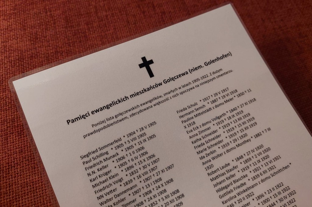 Dziś, 30 października 2022 r. o godzinie 17, wraz z kilkunastoma zgromadzonymi mieszkańcami wsi, dokonaliśmy skromnego uczczenia pamięci Golęczewian wyznania ewangelickiego. Na cmentarnym krzyżu zawisła lista nazwisk zmarłych w latach 1905-1922.
