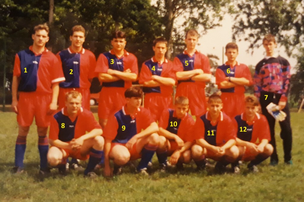 „Zdjęcie jest zrobione w dniu otwarcia boiska na Dworcowej, ledwo się zmieściliśmy w wymiarach, ze względu na zbyt mały teren wytyczony na boisko i rosnące w pobliżu topole, które na inaugurację były owinięte materacami do ćwiczeń, żeby nikomu się nic nie stało w czasie meczu” – wspomina Szymon Kozieł.
