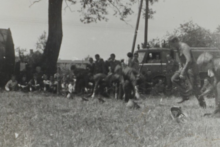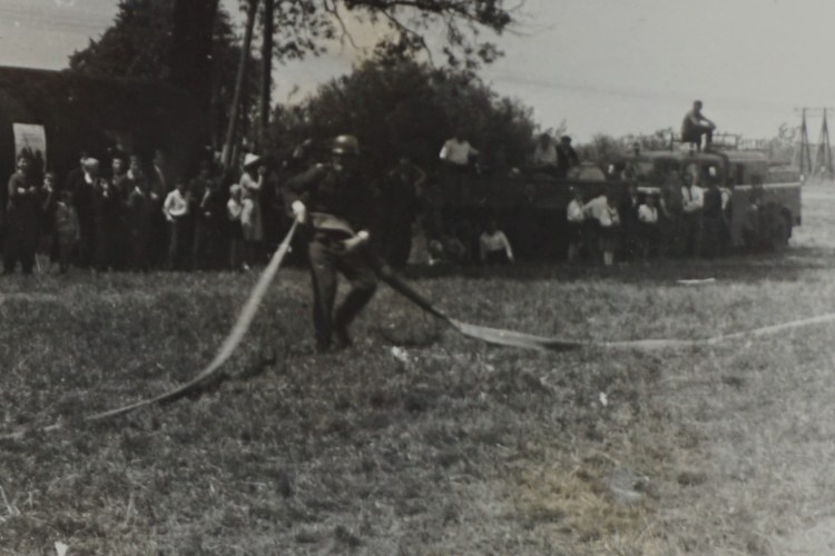Golęczewscy strażacy na ćwiczeniach, czy może zawodach… Seria zdjęć pochodzi z lat 60-tych, najprawdopodobniej z 1963 roku. Na pierwszym dużym zdjęciu z wężem prezentuje się Jerzy Sroka z OSP Golęczewo.