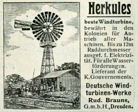 Na wyposażenie składa się: stalowa turbina wiatrowa „System Herkules” o średnicy koła 4,5 m i samoregulacji w zależności od kierunku i siły wiatru; dwustronnie działająca pompa ssąca i ciśnieniowa o średnicy cylindra 100 mm i ciśnieniowym kotle wiatrowym o wydajności godzinowej 5 metrów sześciennych. Urządzenia są dostarczone przez Dresdener Windturbinen-Werken i zamontowane na wieży z kutego żelaza o wysokości 18 m. Dzięki samoregulacji turbiny wiatrowej wiatr ma nieograniczony dostęp do koła ze wszystkich stron.