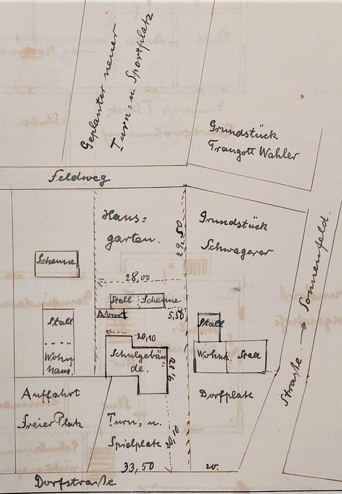Plan sytuacyjny zawarty w inwentaryzacji obejmuje sąsiedztwo szkoły, wraz ze skrzyżowaniem Dworcowej (Dorfstrasse) i Lipowej (Strasse nach Sonnenfeld – okupacyjna nazwa Soboty) oraz ulicą Boczną (Feldweg). Za ulicą Boczną zaznaczono „planowane nowe boisko gimnastyczno-sportowe”. Parcele opisane są nazwiskami niemieckich gospodarzy, osiedlonych podczas wojny (Schwagerer – Lipowa 3; Wahler – Lipowa 5).