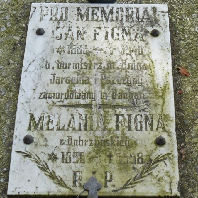 Na początku wojny niemieckie władze aresztowały Jana Fignę jako jednego z działaczy polskiej elity politycznej. Na Wielkanoc 1941 roku żona Melania otrzymała przesyłkę – urnę z prochami męża, przesłaną z obozu w Dachau.