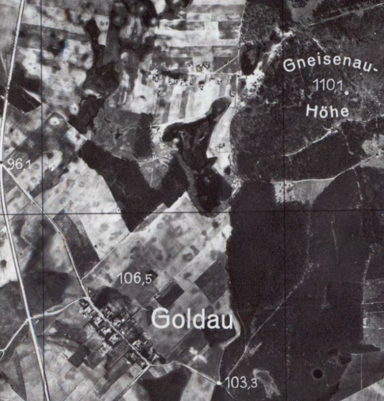 Zdjęcie lotnicze z czasów II wojny św. – zabudowania Majdanów widać w górnej części kadru, wzdłuż wyraźnej drogi. Nieco bardziej na południe, na lewo obok ciemnego obszaru (staw i las) można zauważyć jakiś obiekt na parceli Raszewskich. Goldau to niemiecka nazwa Złotkowa.