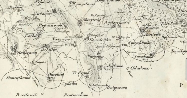 Gdzie szukać Imbierowa? Przeanalizowałem dawne mapy, niestety mało dokładne. Porównując je z terenem przypuszczam, że folwark mieścił się na północnym brzegu łąki, blisko Samicy. Źródło mapy: mapy.cz