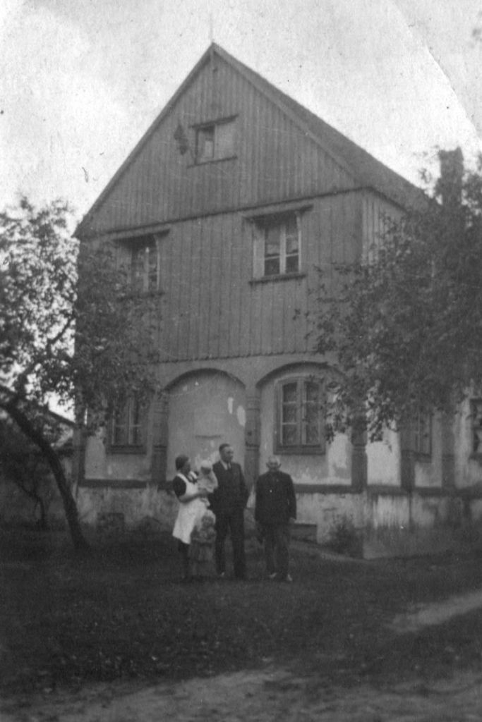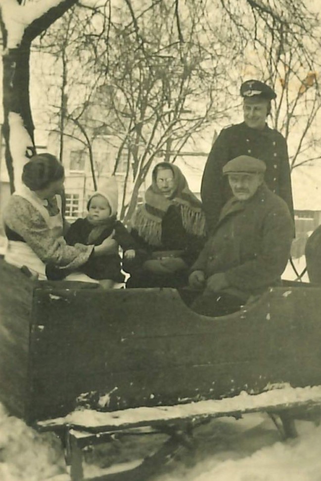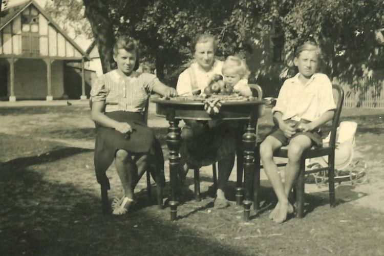 Rodzina Gattke przed domem – w tle fasada golęczewskiej gospody. Od lewej – Elisabeth, matka Ursuli, Ursula, dziadkowie (Melitta i Erdmann). W uniformie Reichsbahn (kolei państwowych) stoi Helmut, ojciec.