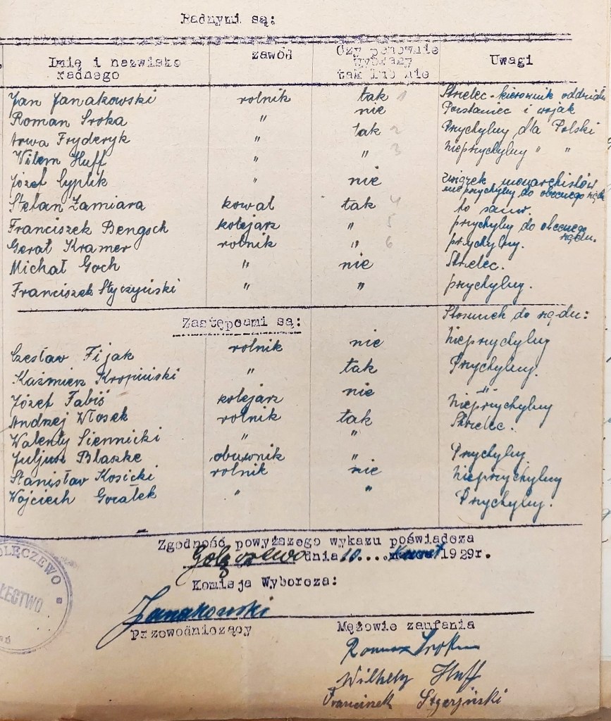 - wśród czterech radnych niemieckich, postawy polityczne były równie zróżnicowane jak wśród Polaków. Trzech zostało określonych jako przychylnych dla Polski lub dla ówczesnego rządu; co ciekawe – jako nieprzychylny dla Polski został uznany radny Wilhelm Huff, który pod tym dokumentem… podpisał się jako mąż zaufania komisji wyborczej