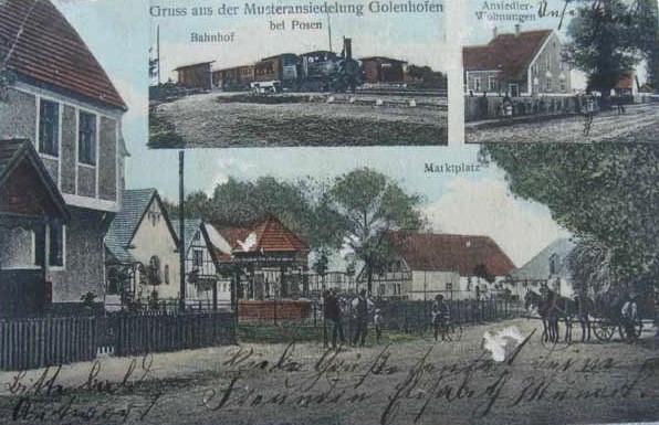 Jedyny znany mi widok pociągu na stacji w Golęczewie sprzed I wojny światowej to niewyraźny kadr na pocztówce, wysłanej w 1912 roku. Obraz jest niestety słabo czytelny – skan pochodzi z archiwum aukcji internetowej. Tę pocztówkę wysłała 12 czerwca 1910 Elisabeth Munack, domagając się szybkiej odpowiedzi od adresatki Ottilie Golk. Munackowie mieszkali w domu na Dworcowej 33 – na zdjęciu w górnym prawym rogu Elisabeth napisała „nasz dom”.