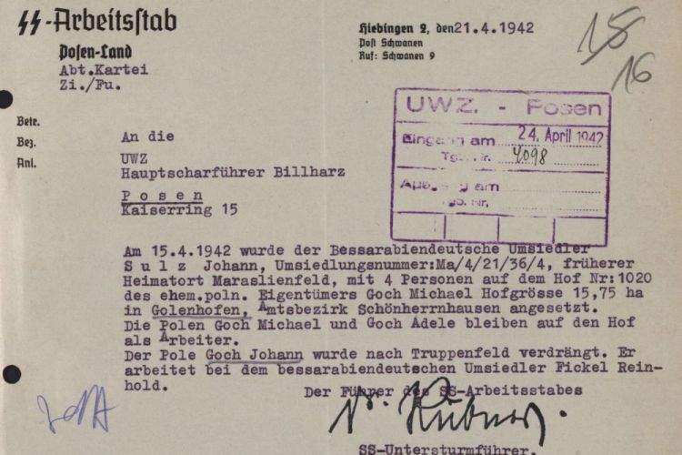 Mieszkający w Besarabii (dzisiejsza Republika Mołdawii i pd. zach. skrawek Ukrainy) Niemcy zostali w 1940 roku przymusowo wysiedleni na mocy niesławnego aktu Ribbentropp-Mołotow. ZSRR i nazistowskie Niemcy, poza IV rozbiorem Polski, ustaliły między sobą, że należąca wówczas do Rumunii Besarabia przejdzie pod sowieckie panowanie, a tamtejsza niemieckojęzyczna ludność będzie ewakuowana do Rzeszy. W ślad za tą decyzją, ponad 90 000 ludzi (!), najpierw wozami a potem statkami w górę Dunaju, migrowało do obozów przesiedleńczych, by potem otrzymać przydział gospodarstw – najczęściej gdzieś w okupowanej Polsce.