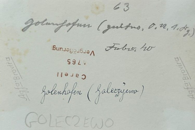 Ciekawych informacji dostarcza odwrót odbitki. Specjalista od spraw militarnych odczytał: Golenhofen – zeitw. O.U. 1. Kp. (zeitweilige Ortsunterkunft, 1. Kompanie). Po polsku byłoby to: Golęczewo – tymczasowe lokalne zakwaterowanie 1 kompanii.