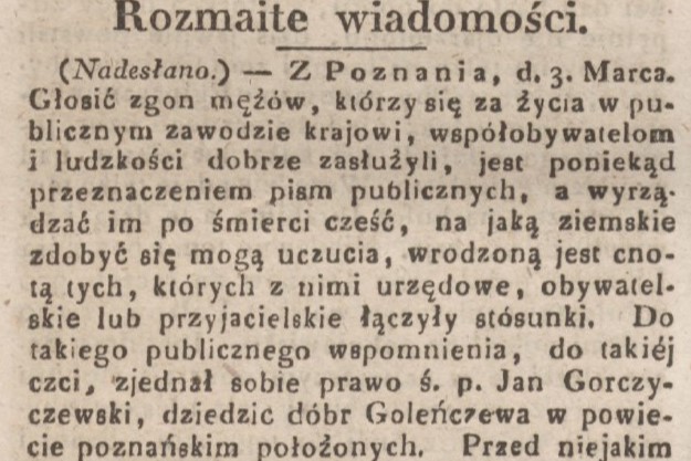 Do takiego publicznego wspomnienia, do takiéj czci, zjednał sobie prawo ś.p. Jan Gorczyczewski, dziedzic dóbr Goleńczewa w powiecie poznańskim położonych. Przed niejakim czasem czując on wątlejącą nić życia, przybył do Poznania, lecz pomimo najusilniejszych starań lekarzy, uległ nieodzownemu wyrokowi śmierci, w saméj męzkiéj sile wieku, bo dopiero lat 54 licząc, na dniu 28. Lutego.