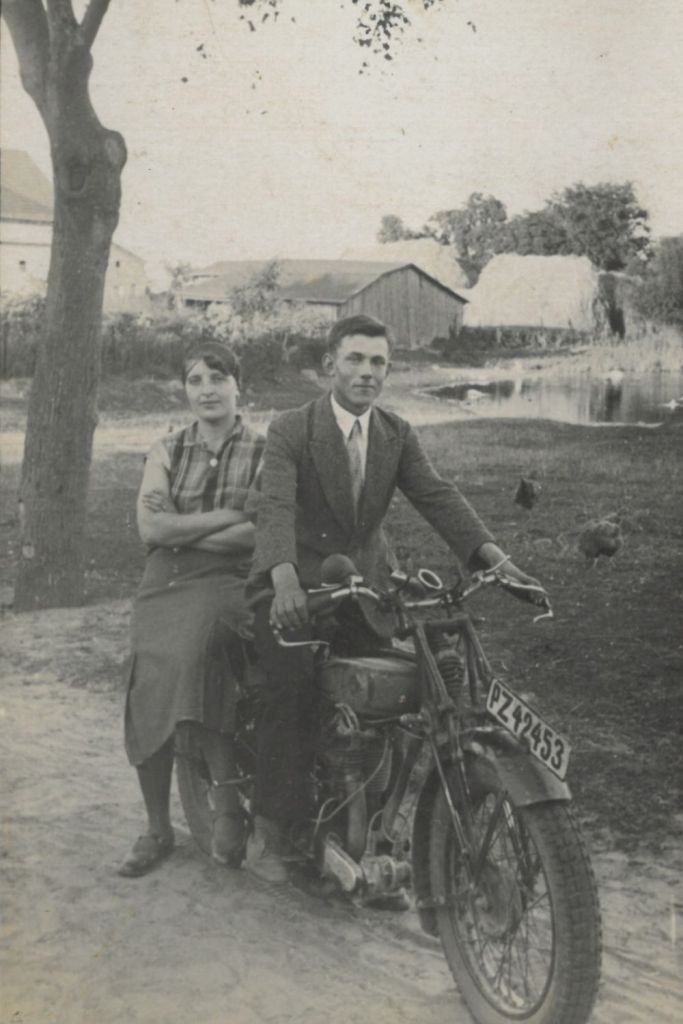 Rozalia z niezidentyfikowanym mężczyzną (podpisane: „kolega”) nad stawem na przy ul. Tysiąclecia. Model motocykla to według znawcy tematu: NSU 201R, ewentualnie Tryumph. Tablica rejestracyjna sugeruje miejscowego – PZ zupełnie jak dziś.