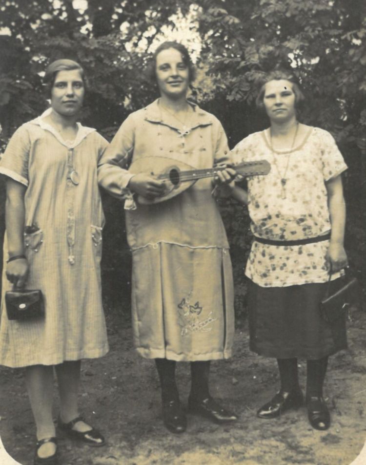 Zdjęcie zrobione tego samego dnia co poprzednie – te same stroje. Siostry Tekla i Rozalia Woźniak, oraz niezidentyfikowana osoba; uzdolniona muzycznie Rozalia trzyma mandolinę; Golęczewo ok. 1928