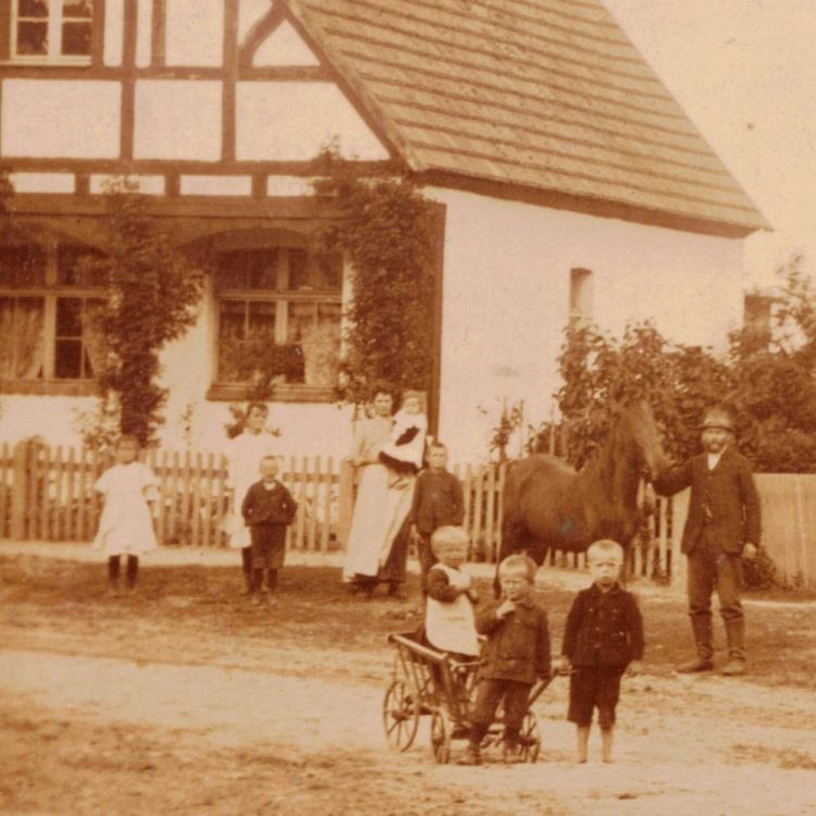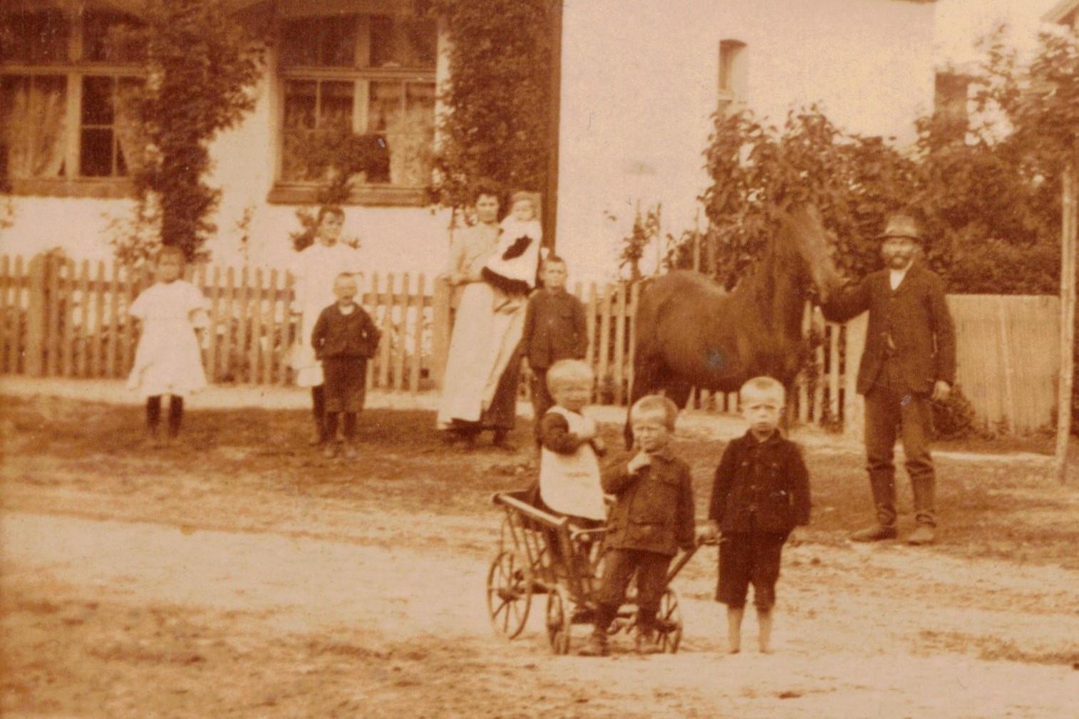 W 1905 roku Johnowie zamieszkali w Golęczewie w narożnym domu (Lipowa 2). Gustav należał do najaktywniejszych obywateli Golenhofen, pełniąc różne funkcje w lokalnej społeczności. Doczekali się siedmiorga dzieci. Na zdjęciu (pocztówka ze zbiorów Manfreda Durdela) możemy domyślać się kilkoro z nich. Najprawdopodobniej na ręku Minny najmłodsza córka Anna (ur. 1911). Od lewej zapewne Margarethe (ur. 1904), Ella (ur. 1901), Paul (ur. 1907), Karl (ur. 1903) i z koniem oczywiście Gustav. Dzieci z przodu – raczej z sąsiedztwa. Jeśli identyfikacja dzieci jest właściwa, zdjęcie pochodzi z 1912 roku.