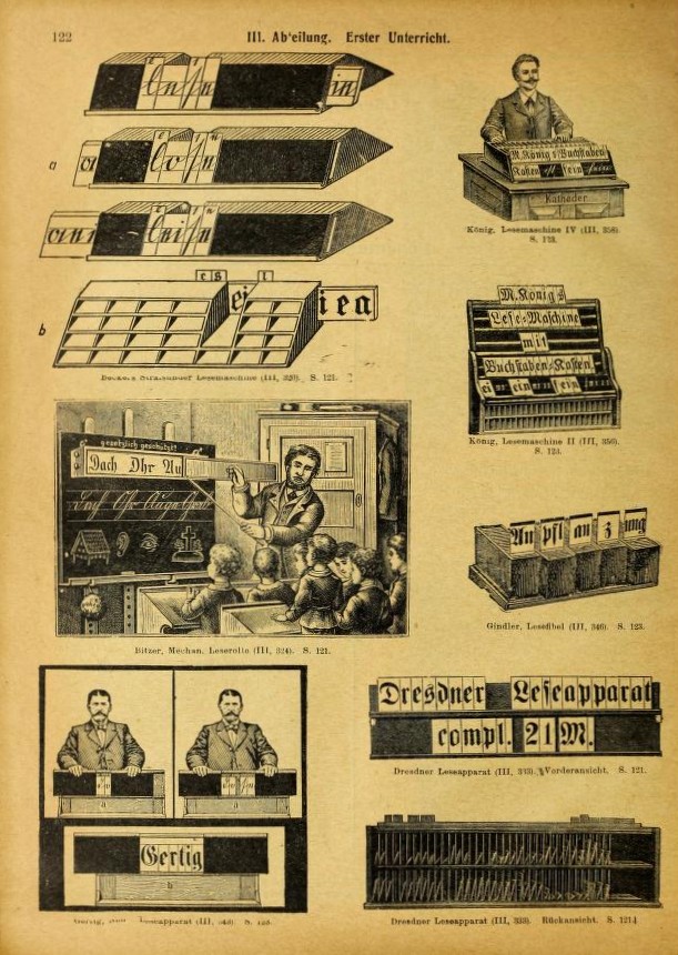 Chodzi prawdopodobnie o pomoc szkolną w postaci drewnianego zestawu z ramami i szynami, w które nauczyciel wsuwał duże litery drukowane na tekturze.
