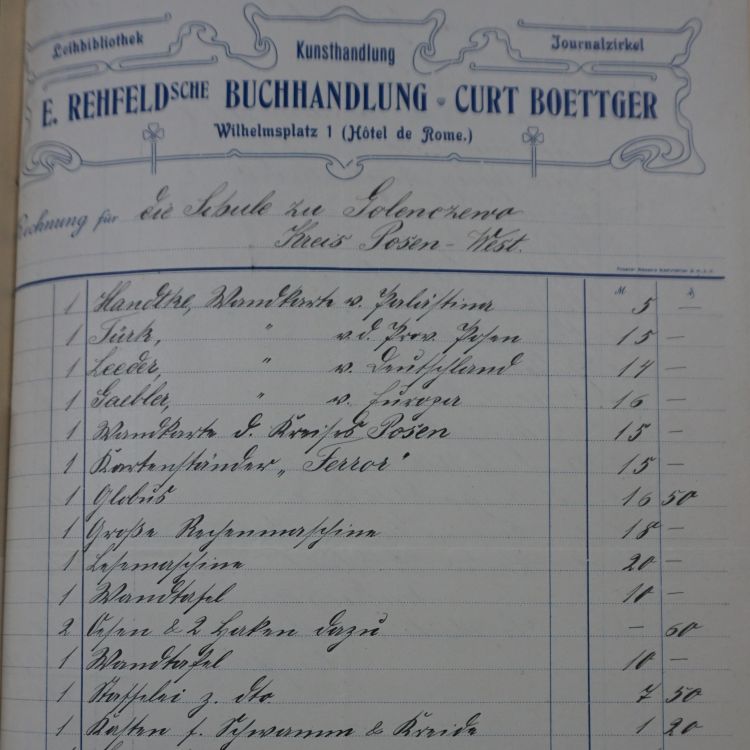 Kwit opiewa na 339 marek i 22 fenigi. Czegóż tam nie ma! Lista daje pojęcie o tym, czego i jak uczono w pruskiej szkole na początku XX wieku. Chociaż pamiętajmy, że Golęczewo było wsią wzorcową – pokazową, i na pewno przeciętna wiejska szkoła nie dysponowała takim wyposażeniem.