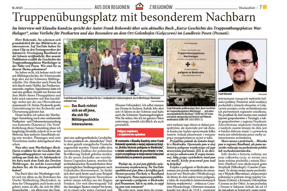 Najnowszy numer (24/1575) wydawanego po niemiecku i polsku tygodnika opublikował artykuł z obszerną wzmianką o golęczewskiej wsi wzorcowej. To zapis rozmowy z Frankiem Rohowskim, autorem albumu z historycznymi pocztówkami z biedruskiego poligonu. Wspomniany album (informacje o nim na podstronie Biblioteka) zawiera również rozdział o Golęczewie, z moją kolekcją historycznych pocztówek z wzorcowej wsi Golenhofen. PełenCzytaj dalej „Opolski Wochenblatt o biedruskim poligonie i Golęczewie”