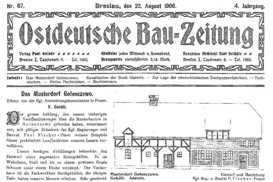 Niemiecka wieś wzorcowa Golęczewo była w okresie budowy tematem wielu wzmianek w prasie – zwłaszcza w tych mediach, które były poświęcone architekturze, urbanistyce i kształtowaniu krajobrazu. Jednym z nich, które poświęciły uwagę naszej wsi, była wrocławska Ostdeutsche Bau-Zeitung (Wschodnioniemiecka Gazeta Budowlana). Tytuł wydawany był aż dwa razy w tygodniu (w środy i niedziele), co możeCzytaj dalej „1906: Dworcowa 53 w Ostdeutsche Bau-Zeitung”