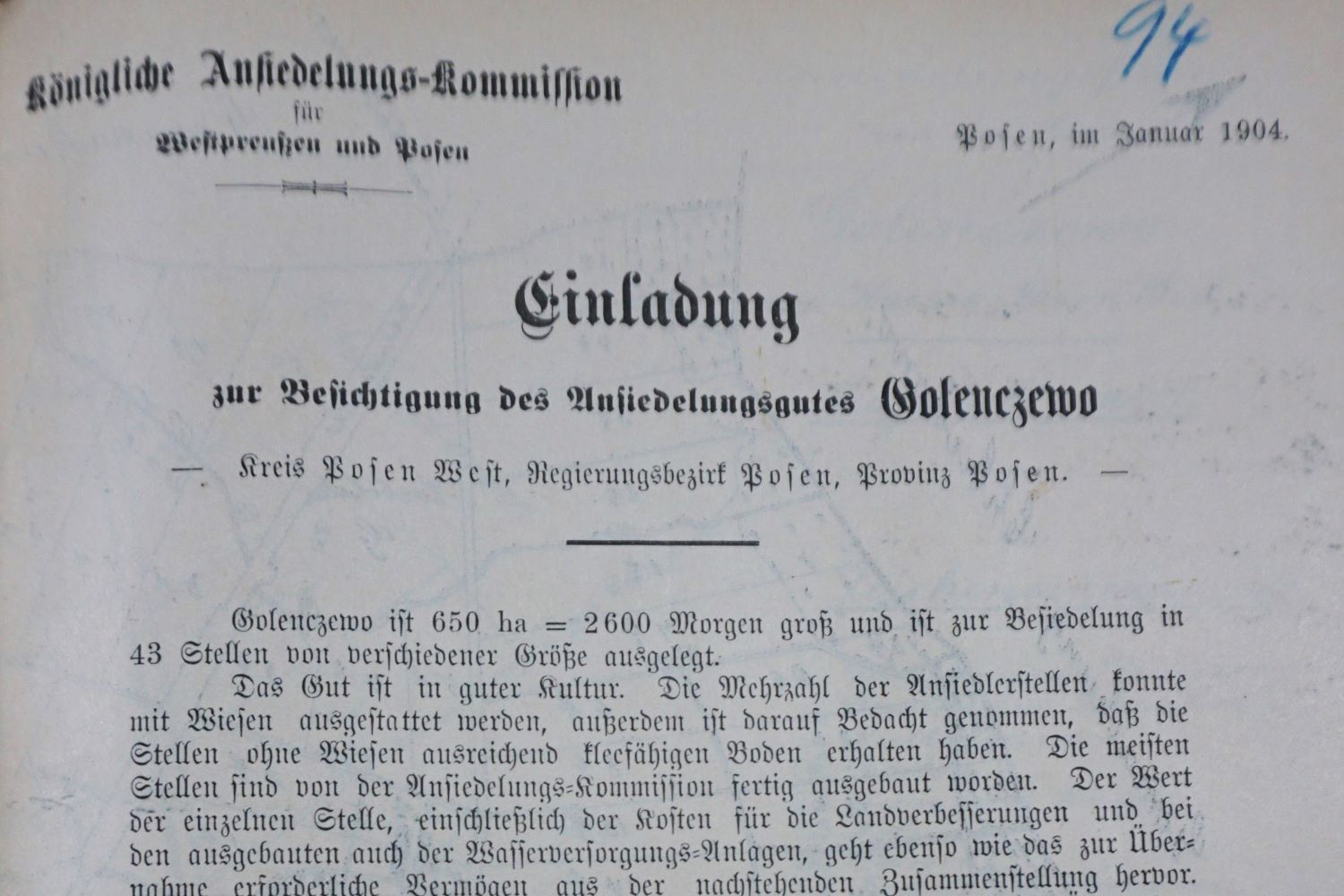 W 1904 roku wzorcowa niemiecka wieś była już niemal gotowa do zasiedlenia. O tym, czym przekonywano potencjalnych mieszkańców do osiedlenia się w Golęczewie, możemy się przekonać czytając ulotkę, którą przygotowała pruska Komisja Osadnicza. Ulotka pochodzi ze zbiorów gnieźnieńskiego oddziału Archiwum Państwowego w Poznaniu. Przytaczam jej treść niemal w całości. Zaproszenie do odwiedzenia osiedla Golenczewo PowiatCzytaj dalej „1904: Ulotka reklamowa dla potencjalnych osadników w Golęczewie”