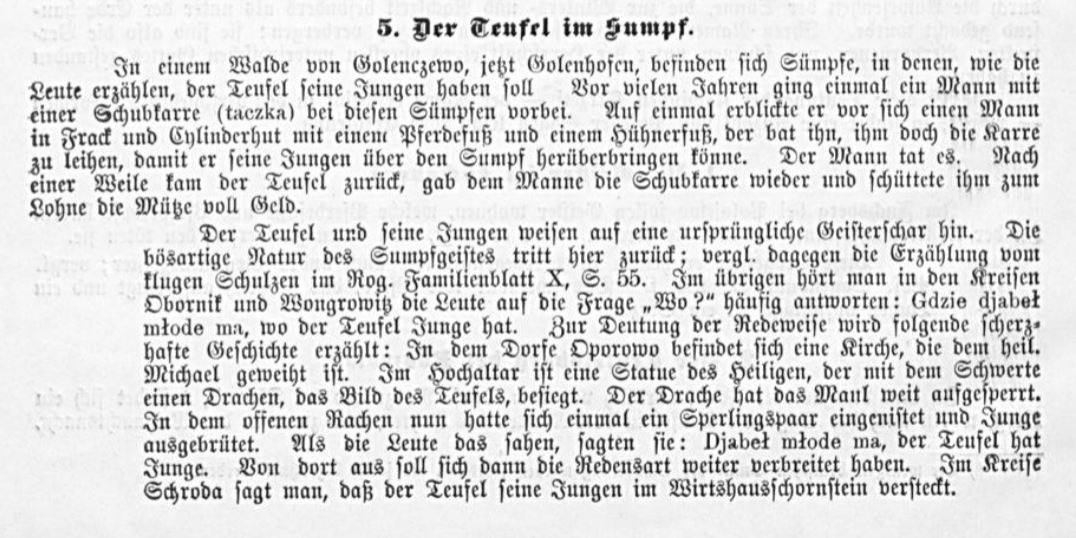 Po długich internetowych poszukiwaniach udało mi się odnaleźć treść krótkiego podania, zapisanego przez Otto Knoopa i wydanego w 1912 roku w zbiorze bajek przez gimnazjum w Rogoźnie jako „dodatek naukowy do programu wielkanocnego”. Swoją drogą ciekawe, że uczniom gimnazjum na Wielkanoc serwowano ludowe opowieści o diabłach… Diabeł z bagien W pewnym lesie pod Golenczewem (obecnieCzytaj dalej „1912: Diabeł z golęczewskich bagien”