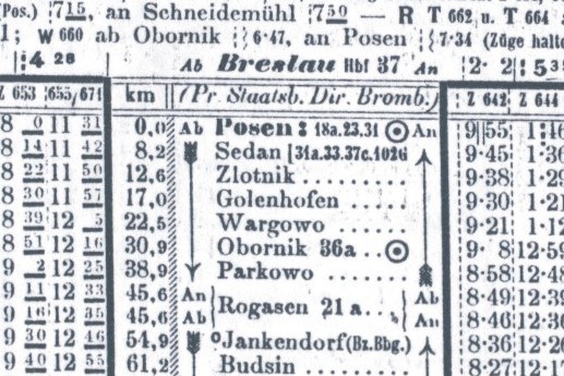 Przystanek kolei w Golenhofen powstał w 1904 roku. Rzućmy okiem na kilka rozkładów jazdy. Pierwszy rozkład linii Posen-Belgard pochodzi z 1914 roku. Co ciekawe, 70 lat później pokonanie dystansu z Poznania do Golęczewa zajmowało więcej czasu niż „za Wilusia”. Rozkłady z lat 30, 40 i 80 ze zbiorów p. Krzysztofa Springera.