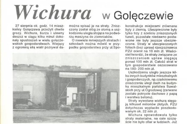 „27 sierpnia ok. godz. 14 mieszkańcy Golęczewa przeżyli chwile grozy. Wichura, burza i ulewny deszcz w ciągu kilku minut dokonały spustoszeń w wielu golęczewskich gospodarstwach” – pisała Gazeta Sucholeska. Dziś to wydarzenie rekonstruuje w fachowym ujęciu znawcy tornad – Joanna Kubiak, mieszkanka Golęczewa, od dziecka zafascynowana tymi zjawiskami pogodowymi. Trąba powietrza w Golęczewie – schwytanyCzytaj dalej „1992: tornado uderza w Golęczewo”