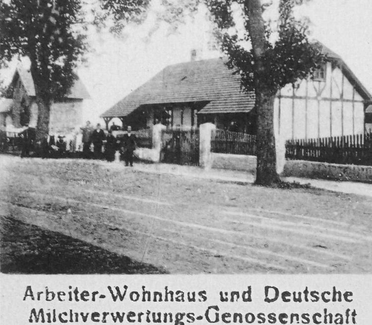 Dom poza zabudowaniem werandy z prawej strony, nie zmienił się mocno. Na fragmencie starej pocztówki możemy zauważyć grupę osób – zapewne mieszkańców bliźniaka. W tle z lewej widać nieistniejącą już zlewnię mleka. Prawdopodobnie pierwszymi mieszkańcami bliźniaka byli zatrudnieni w spółdzielni mleczarskiej, zarządzającej zlewnią mleka.