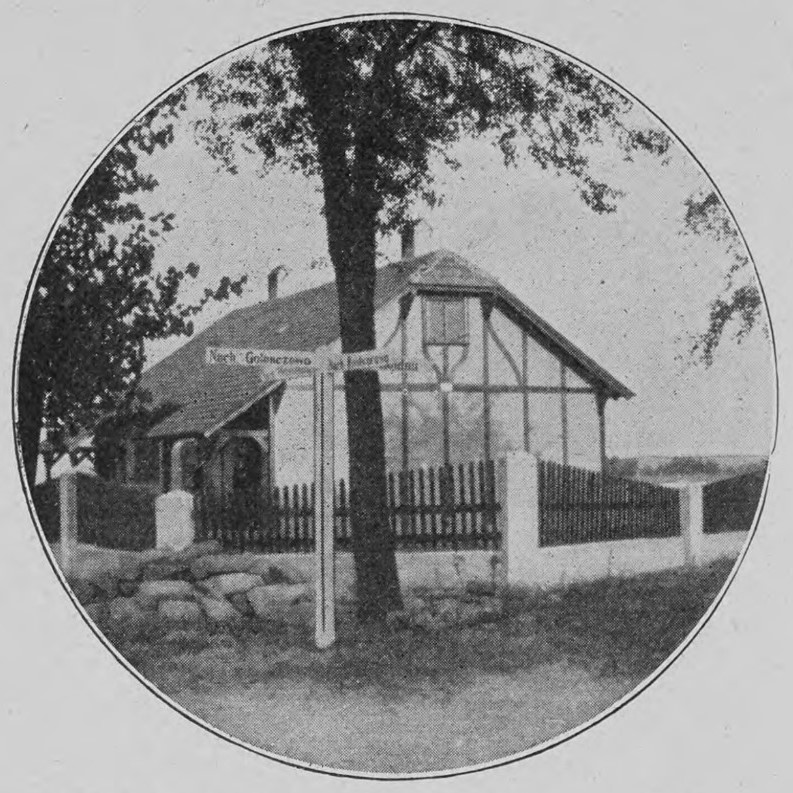 Jeszcze jeden widok domu, z ilustracji w czasopiśmie „Uber land und Meer” z 1908 r. Zwraca uwagę drogowskaz – na północ „Nach Golenczewo” (ul. Kręta, w stronę dawnego majątku); na południe – Goldau (Złotkowo, to ulica Czereśniowa) i na zachód – Rostworowo (ul. Dworcowa).