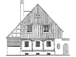 Budynek zwraca uwagę wysokim szczytem i charakterystycznymi drewnianymi słupami na fasadzie. W ten sposób projekt nawiązywał do form tradycyjnego budownictwa w południowej Saksonii i na Łużycach. Konstrukcja przysłupowa polega na tym że ciężar piętra wspiera się na systemie słupów. W tamtym regionie na szeroką skalę w domach pracowały warsztaty tkackie. Dzięki temu drgania krosien nie przenosiły się na mieszkalne piętro.