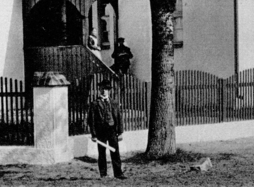 Historyczne zdjęcie, przed historyczną stodołą. To tutaj, w bezpiecznym ukryciu rodzina Wygachiewiczów ukryła na czas okupacji figurę NMP z centrum Golęczewa, niechybnie ratując ją przed zniszczeniem przez niemieckiego okupanta. Zdjęcie zostało wykonane kilka lat przed tymi zdarzeniami – ok. 1935 roku. Nieistniejąca już stodoła stała z tyłu posesji na Tysiąclecia…
