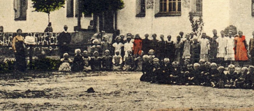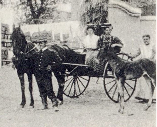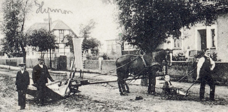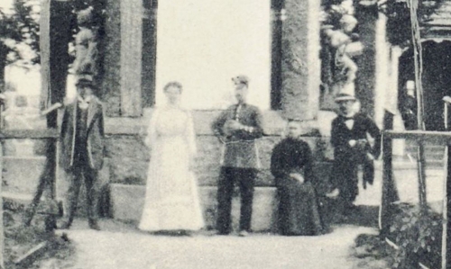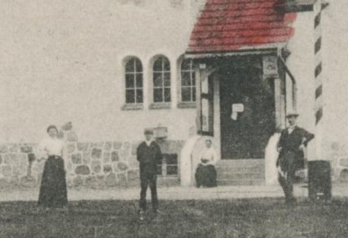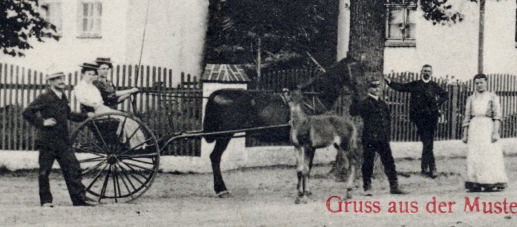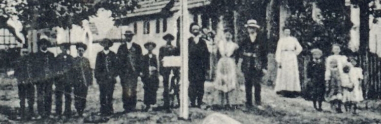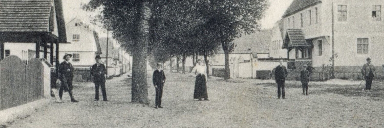 Fragmenty pocztówek z początku XX wieku. Z pewnością większość z nich to mieszkańcy wsi, niejednokrotnie dumnie ustawieni pod swoim domostwem. Możliwe, że dwukółką, sfotografowaną dwukrotnie przed gospodą, powozi Margaret Radeck. Z kolei zdjęcie pod ozdobnym ujęciem wody z grupą elegancko ubranych osób przedstawia być może uczestników wycieczki, zwiedzających wzorcowe osiedle.
