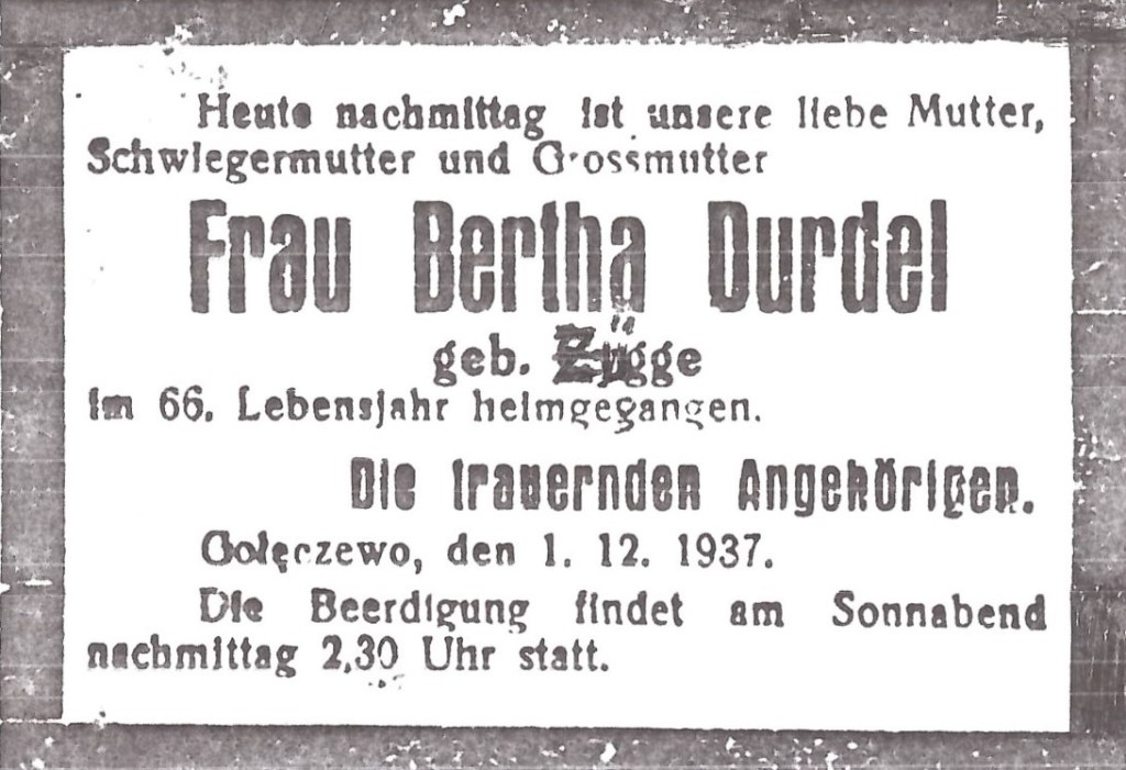Nekrolog z lat 1930-tych: Bertha Durdel. Z archiwum Manfreda Durdela.