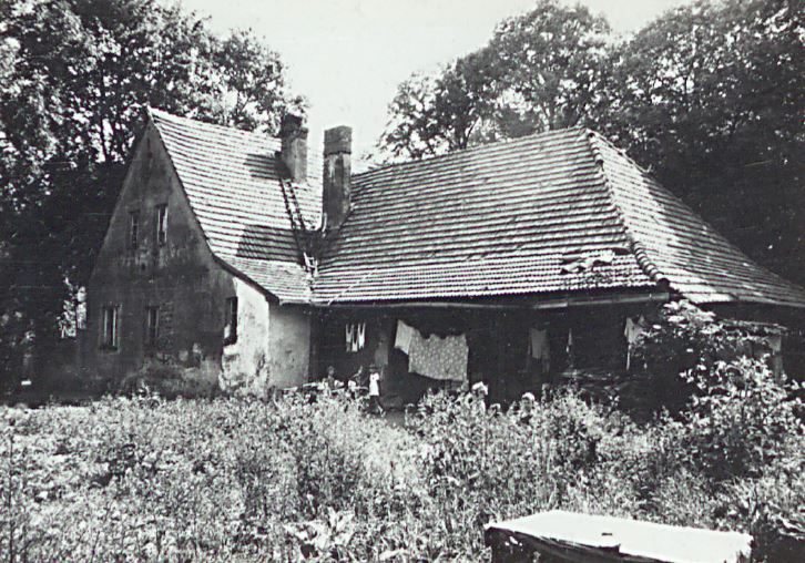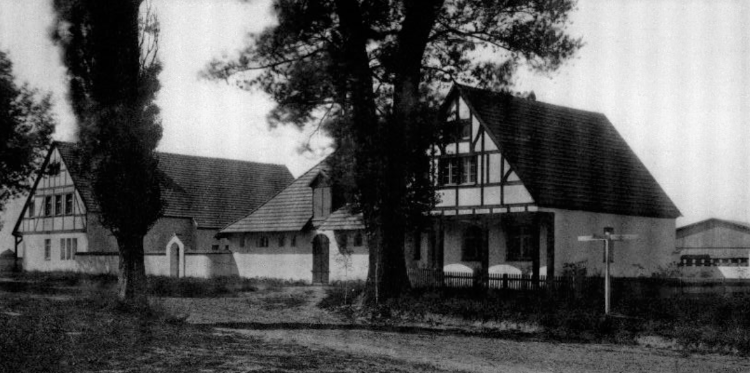 Na zdjęciu ze starej pocztówki, przed domem zgromadziła się grupa osadników Golenhofen. Bardzo możliwe, że pod drogowskazem stoi rodzina Johnów.