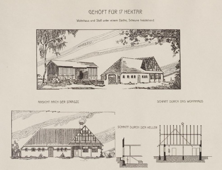 Katalog projektowy Paula Fischera prezentuje pierwotną koncepcję budynku mieszkalnego z oborą oraz wolnostojącej stodoły.