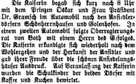 Małżonka Wilhelma II, być może najbardziej wpływowa osoba, która odwiedziła Golęczewo. Podczas poznańskich „Dni Cesarskich” (Kaisertage) w sierpniu 1910 roku, jak pisała namysłowska gazeta Namslauer Stadtblatt, cesarzowa Augusta Wiktoria i inni szacowni goście odbyli samochodową wycieczkę do wsi osadniczych Schönherrnhausen (dziś Piątkowo) i Golenhofen, a dzieci z obydwu wsi ugościły cesarzową kawą i ciasteczkami. Nie jestem jednak pewny wizyty Augusty Wiktorii w Golenhofen, jako że lokalny Posener Tageblatt wspomina wizytę wyłącznie w Schönherrnhausen. To jak było?