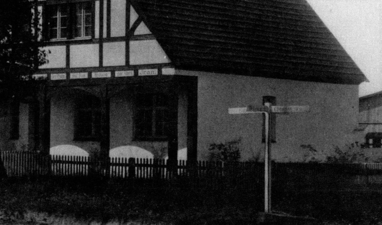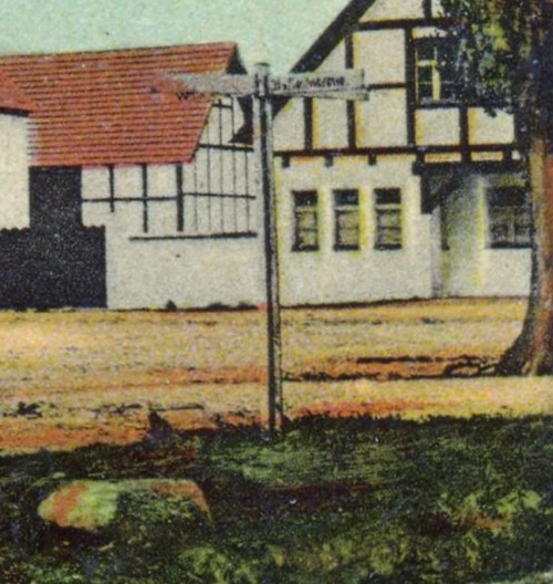 Zaś tu (w tle dom Lipowa 3 i nieistniejący budynek gospodarczy przy szkole) drogowskaz pisany gotycką czcionką wskazuje Rostworowo – dziś kierunek na Zielątkowo.